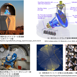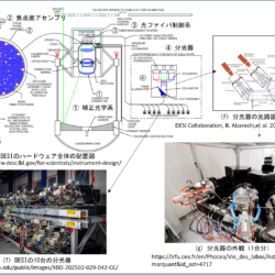 キットピーク国立天文台の口径4 mメイヨール望遠鏡の主焦点用の広視野主焦点補正光学系とともに開発された、約5000本の光ファイバーをもつ多天体分光器(Dark Energy Spectroscopic Instrument: DESI; デジーと発音される)システム。約110億年昔(赤方偏移にしてz~2.3)から現在までの宇宙膨張の歴史を描き出すことにより、ダークエネルギーの理論モデルを検証することを主目的とするサーベイ観測のために開発された。