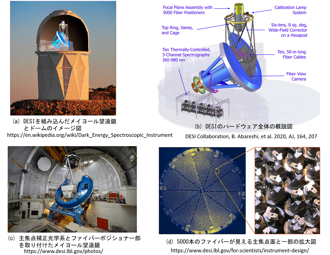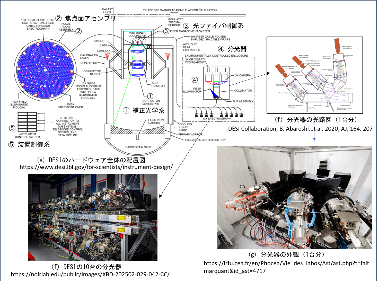新たな補正光学系を備えたメイヨール望遠鏡の主焦点の視野直径は3度である。DESIは、その焦点面で5000個の光ファイバー端を制御するロボット式ファイバーポジショナー、天体の光を分光器まで送る長さ50 mの5000本の光ファイバー、10台の分光器、それらを制御する制御系およびデータ解析システムなどからなる巨大なシステムである。新しい視野を観測するためファイバーポジショナーが5000本のファイバー端の配置換えを行うのに必要な時間はわずか3分である。10台の分光器は主焦点のはるか下のドーム床にある温度制御された部屋に置かれている。各分光器は入射光を青(${\small 360<\lambda<555\,{\rm nm};R= 2,000-3,200}$)、赤(${\small 555<\lambda<656\,{\rm nm};R= 3,200-4,100}$、赤外(${\small 656<\lambda<800\,{\rm nm};R= 4,100-5,000}$)の3つの波長帯に分けてスペクトルを記録できる(${\small\lambda}$ は波長、${\small{R}}$ は 波長分解能)。