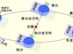 1 天の赤道と黄道が交わる春分点と秋分点のこと。太陽がこれらの点を通過する瞬間が春分と秋分である(二至二分も参照)。太陽が天の赤道上、すなわち地球の自転軸に垂直な方向に来るのも、概ね春秋分の瞬間と考えてよい。