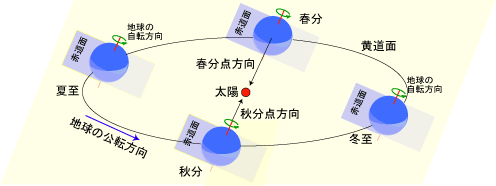 1 天の赤道と黄道が交わる春分点と秋分点のこと。太陽がこれらの点を通過する瞬間が春分と秋分である(二至二分も参照)。太陽が天の赤道上、すなわち地球の自転軸に垂直な方向に来るのも、概ね春秋分の瞬間と考えてよい。