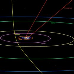 オウムアムア(赤色)とボリソフ彗星(黄色)の軌道。