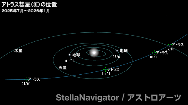 アトラス彗星の太陽系内の位置(「ステラナビゲータ」で星図作成。
