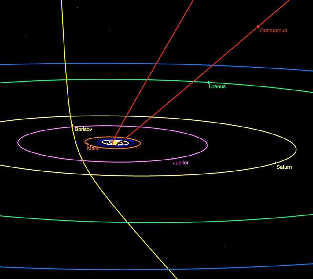 オウムアムア(赤色)とボリソフ彗星(黄色)の軌道。