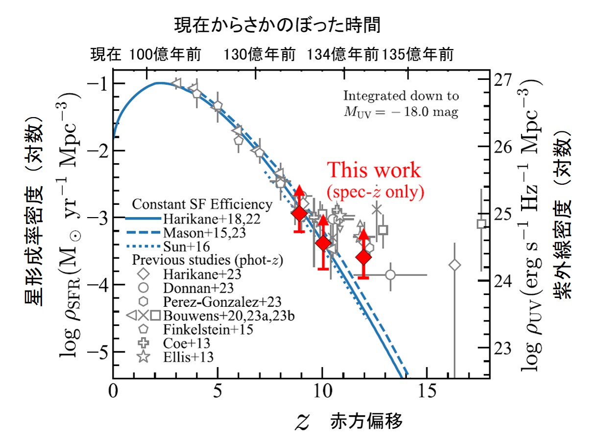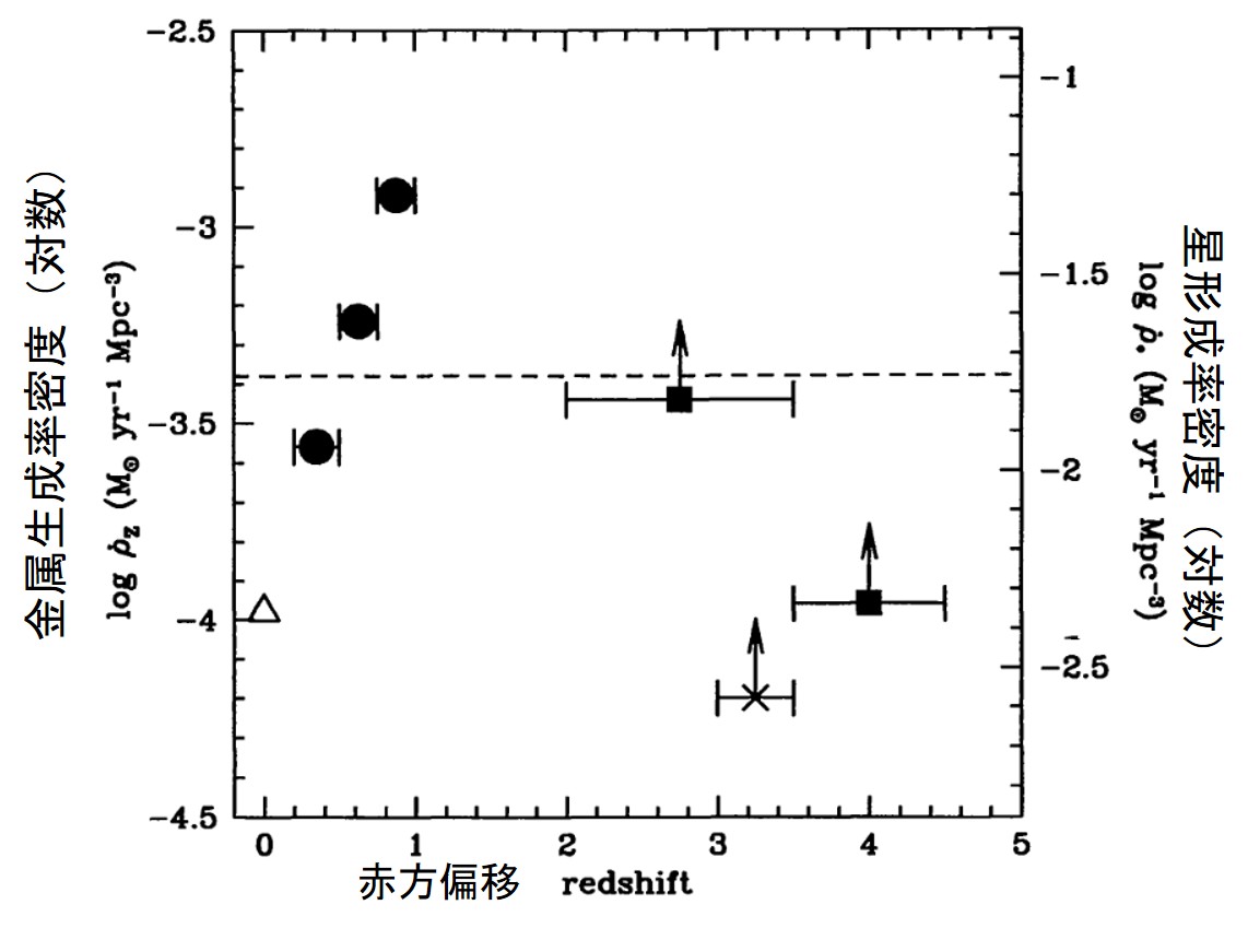 宇宙全体を平均した単位体積当たりの星形成率(星生成率)を赤方偏移(z)の関数として表した図。マダウプロットとも呼ばれる。宇宙における星形成史および金属(重元素)の生成史を理解する鍵となる情報である。この図をはじめて提案したのが1996年に発表されたマダウ(Piero Madau)らの論文であったので、それ以降マダウ図と呼ばれるようになった。この論文で初めてハッブル宇宙望遠鏡による赤方偏移zが2を越える銀河に基づくデータが示され、宇宙の星形成活動がz~1-2でピークになっていることが示唆された(宇宙の真昼を参照)。