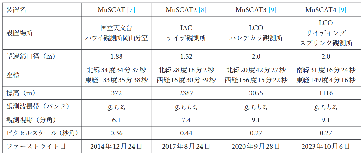 MuSCATの1号機は3色の装置で、2014 年 12 月 24 日に国立天文台岡山天体物理観測所でファーストライトを迎え、2015 年から1.88m望遠鏡の共同利用観測に供された。その後、4色の装置が2017年にテネリフェ島のテイデ観測所(MuSCAT2)、2020年にハワイのマウイ島ハレアカラ観測所(MuSCAT3)、2023年にオーストラリアのサイディングスプリング天文台(MuSCAT4)に設置され運用が続いている。北半球の時差の離れた 3 台の望遠鏡に搭載されているため、北天で起こるトランジットを効率的に観測できる。2023年からは南天の望遠鏡も加わり、南天のトランジット観測も開始した。